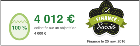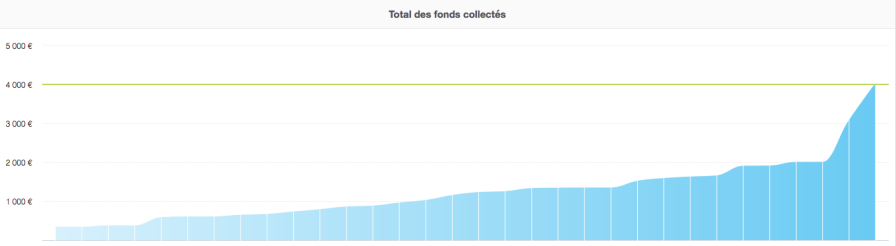 Chaque colonne bleue représente une journée de notre campagne, et sa hauteur indique le montant cumulé des contributions. Quand on voit cette courbe évoluer chaque jour, il est parfois difficile de rester optimiste malgré les messages rassurants qui rappellent que "tout peut se jouer dans les dernières 48 heures". Force est de constater qu'ils avaient raison, chez Ulule, mais quel soulagement quand à moins de 45 minutes de la fin de la campagne, la dernière colonne touche la ligne verte, même à peine, et que ce logo apparait sur la page du projet :